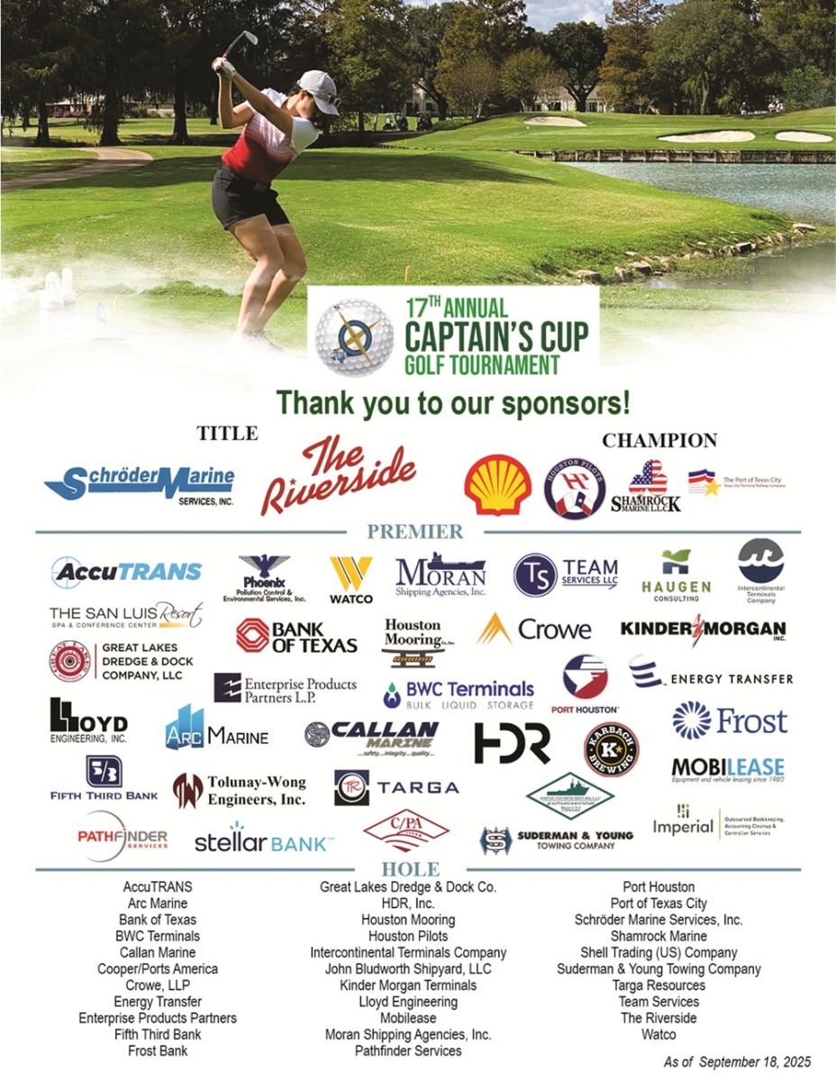 The Captain’s Cup Golf Tournament is the Houston port region’s premier annual golfing event. It features a full day of sport, networking, prizes, and dinner at the Sugar Creek Country Club. A sell-out each year, it is the spot to be for connecting on the greens for our local maritime industry!