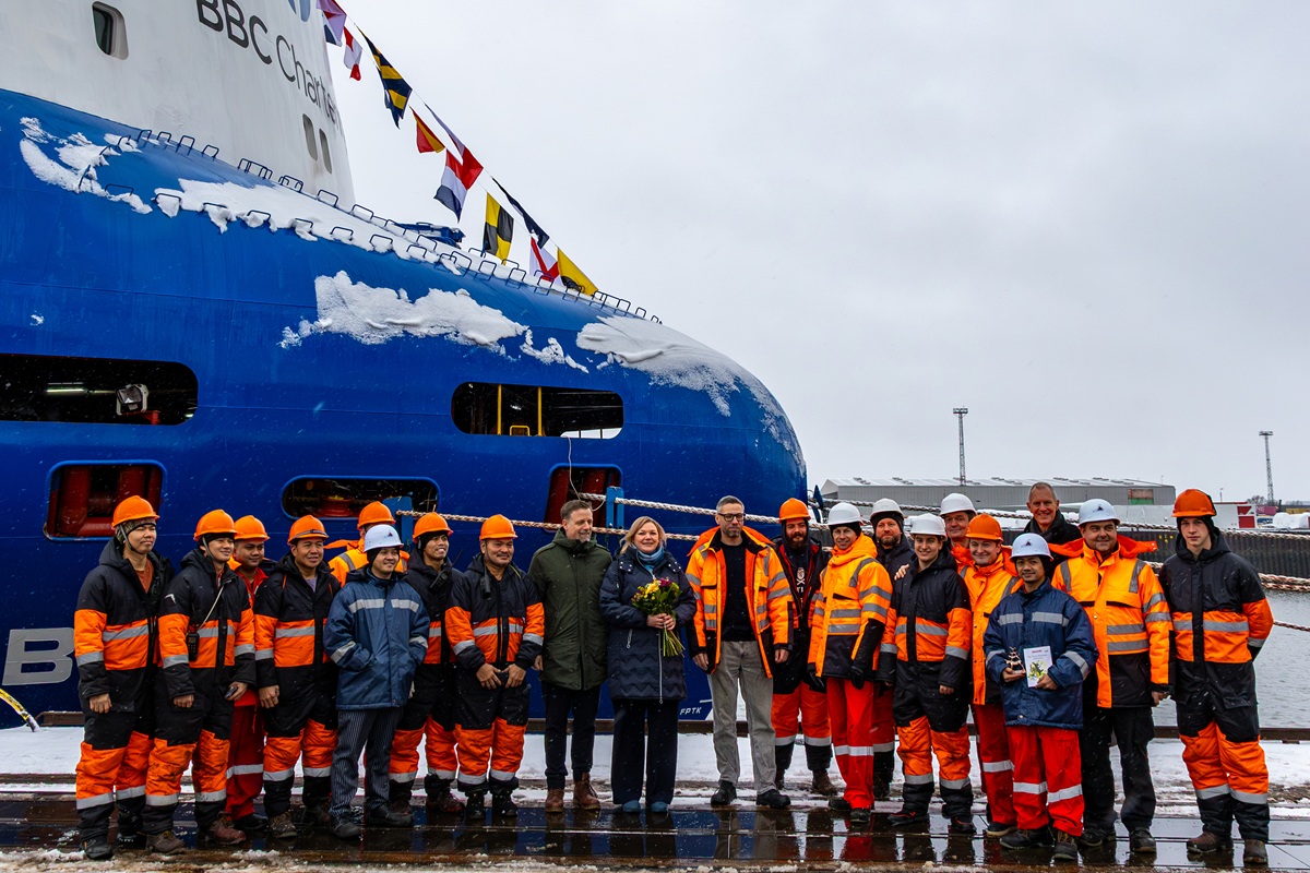 Photo above right: The godmother of the BBC Bremen, Anitta Schumann, with Captain Maksym Aleynikov to her left, Knut Voigt (head of the BBC Chartering Bremen office) to her right, and Ulrich Ulrichs, CEO of BBC Chartering (right in the background) with the entire crew in front of the ship. Photo © Marko Stampehl