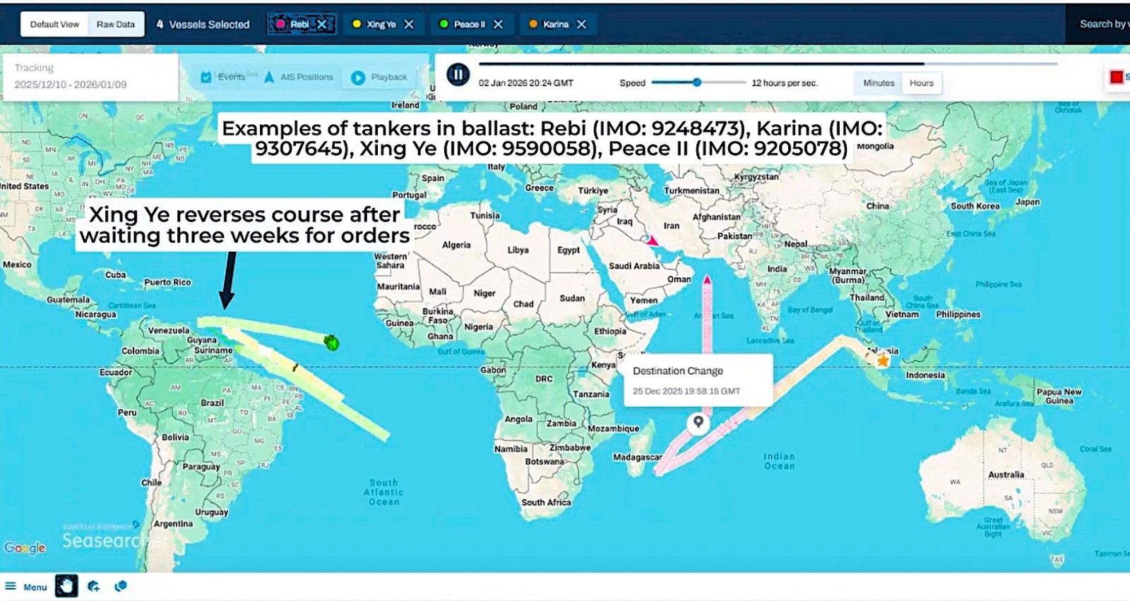 The VLCC was heading toward Venezuela in ballast when it began drifting on December 19, waiting for nearly three weeks before reversing course on January 8.